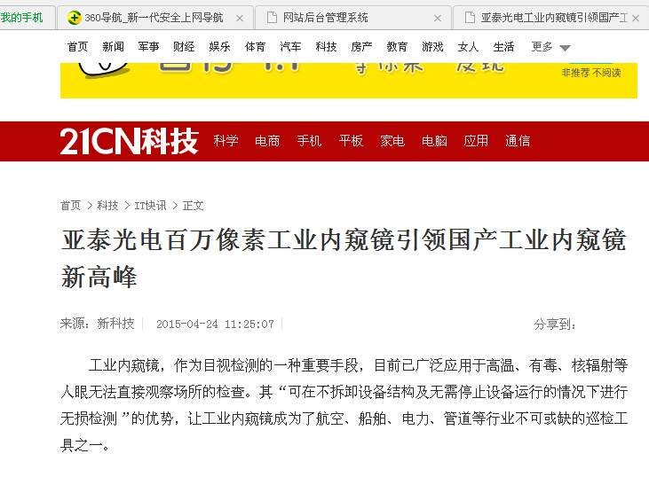 21CN科技:亞泰光電百萬像素工業內窺鏡引領國產工業內窺鏡新高峰