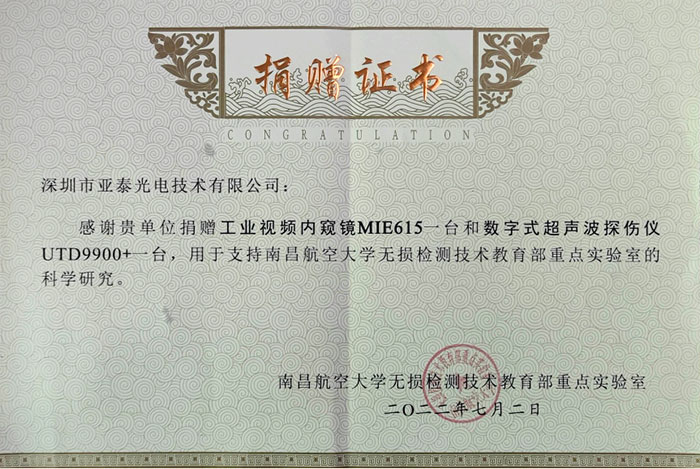 據(jù)悉,本次捐贈(zèng)的兩臺(tái)設(shè)備為亞泰光電工業(yè)視頻內(nèi)窺鏡MIE615和數(shù)字式超聲波探傷儀UTD9900+,價(jià)值約6萬(wàn)元。工業(yè)視頻內(nèi)窺鏡MIE615是一款機(jī)械360°轉(zhuǎn)向視頻內(nèi)窺鏡,用于各種狹小空間的目視檢測(cè)工作。機(jī)身輕便便于攜帶,插入管可更換結(jié)構(gòu),一臺(tái)主機(jī)可搭配不同規(guī)格直徑的插入管,既滿足了客戶多方面的使用需求,又可以大大節(jié)約設(shè)備費(fèi)用。可廣泛應(yīng)用于發(fā)動(dòng)機(jī)、電力、石化、鐵路、船舶等領(lǐng)域。數(shù)字式超聲波探傷儀UTD9900+它能快速低成本地探測(cè)工件內(nèi)部裂縫,夾雜,氣孔,疏松等多種缺陷,廣泛用于機(jī)械制造,鋼結(jié)構(gòu),化工設(shè)備,造船,壓力容器等領(lǐng)域進(jìn)行質(zhì)量控制的有力工具。它較好地解決了有些數(shù)字式儀器操作不方便的問題。