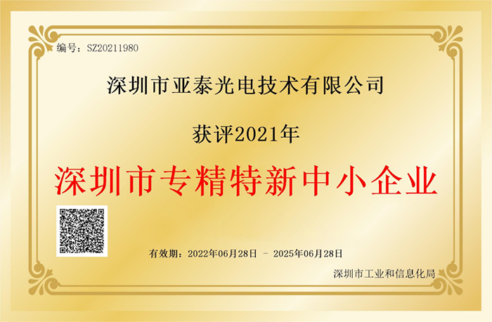 深圳亞泰光電經(jīng)過五年的披荊斬棘與風(fēng)雨兼程,憑借著行業(yè)的專業(yè)性、管理體系的完善性及強大的研發(fā)創(chuàng)新能力,獲得了2021年度深圳市“專精特新”中小企業(yè)殊榮。
