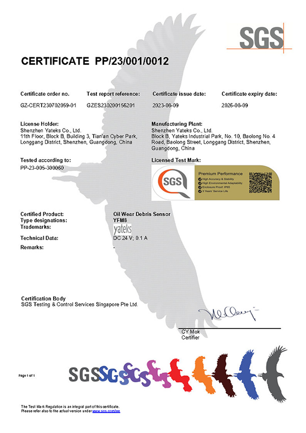 亞泰光電油液金屬磨粒傳感器通過了SGS嚴(yán)格的高低溫、濕熱循環(huán)、沖擊振動(dòng)、包裝跌落等環(huán)境類測(cè)試,以及包括EMC和安全性在內(nèi)的法規(guī)類測(cè)試。經(jīng)測(cè)試驗(yàn)證,傳感器的壽命和功能性符合宣稱,最終取得了SGS頒發(fā)的首張傳感器性能認(rèn)證(Sensor Trust)項(xiàng)目Premium Performance證書。