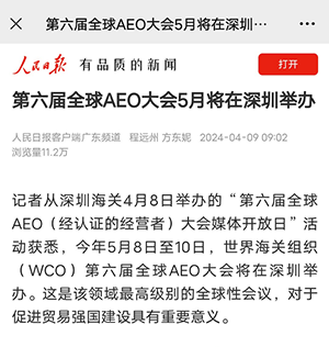 https://wap.peopleapp.com/article/7392159/7224555(人民日報——第六屆全球AEO大會5月將在深圳舉辦)