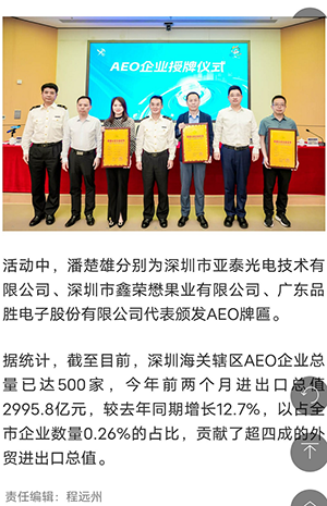 第六屆全球AEO大會將于今年5月在深圳隆重舉行,此次大會受到人民日報的關注,并在“有品質的新聞”進行了專題報道,文中提到:屆時深圳海關領導將向深圳亞泰光電代表頒發(fā)AEO牌匾。這一盛會將在全球范圍內(nèi)進一步推動行業(yè)交流與合作,為近千名參會者帶來無與倫比的學習和交流機會。這是該領域最高級別的全球性會議,對于促進貿(mào)易強國建設具有重要意義。